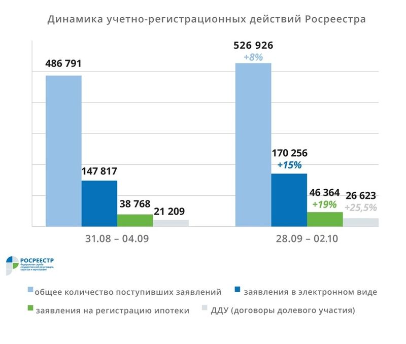 Увеличилось и число заявлений на регистрацию договоров долевого участия. Их количество по итогам прошлой недели составило 26 623, что на 5 % больше, чем на предыдущей неделе, и на 25,5 % больше, чем за аналогичный период сентября. Из них свыше 48 % – в электронном виде.