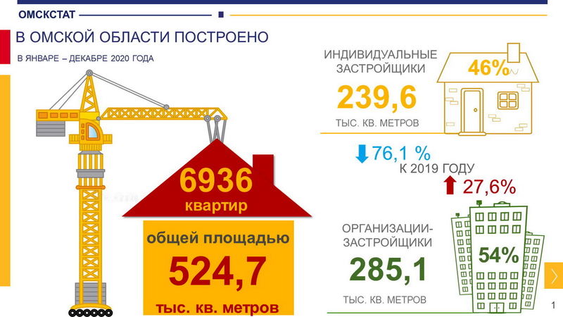 Омскстат представил итоговые результаты сферы жилищного строительства за 2020 год. Как сообщили аналитики, в регионе было ведено в эксплуатацию 6936 квартир: 5333 построили организации-застройщики, 1603 – население. Средний размер помещений, возводимых юрлицами, составил 53 квадратных метра, индивидуальными застройщиками – 149 кв. метров. Всего же в регионе построили 524,7 тысяч квадратных метров жилья, по сравнению с предыдущим годом темпы возведения сократились на 2,5 %.