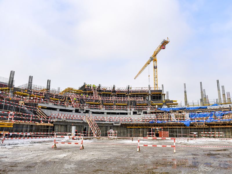 Сейчас на объекте начались подготовительные работы к монтажу плиты перекрытия и вертикальных конструкций 4-го этажа. Как сообщили в пресс-службе «Авангарда», работы идут одновременно на всех участках. Завершен монтаж стен и колонн первого этажа. Продолжается бетонирование перекрытия и вертикальных конструкций 2-го и 3-го этажей, а также формирование арматурного каркаса подтрибунных балок.