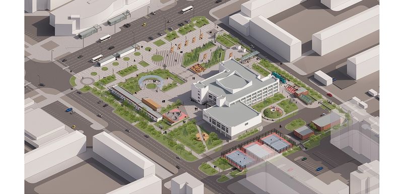 Автор второй концепции – архитектор Никита Шалмин – предлагает обеспечить эффектный обзор одного из главных коммуникационных объектов площади – «Форума» – места проведения студенческих праздничных и торжественных мероприятий.