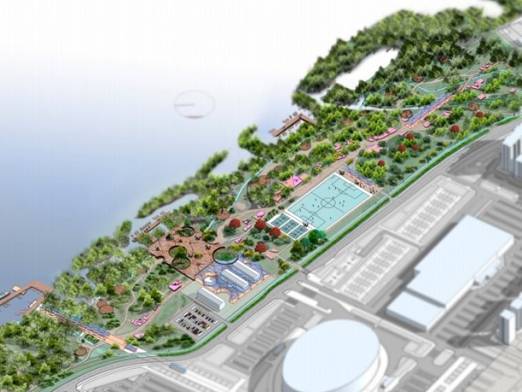 Согласно представленной концепции, в парке хотят сохранить природный характер территории – остаются «не тронутыми» береговые перепады рельефа, пойменная (затапливаемая) часть, максимально сохраняются существующие там виды флоры и фауны. В парке предполагается точечное размещение зон активности: спортивных площадок, причалов, зон отдыха, велодорожек и экотроп.
