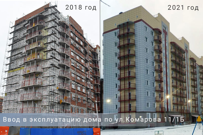 Завершено строительство и выдано разрешение на ввод в эксплуатацию 9-этажного жилого дома на 152 квартиры по адресу пр. Комарова, 11/1Б. Застройщиком дома выступало ООО «Джаст Фит Лайф», а подрядчиком – ООО «ПМК-944 Треста Железобетон». Порядка 125 квартир были выкуплены еще на начальном этапе строительства, но при строительной готовности объекта в 85 % работы были остановлены в связи с признанием застройщика банкротом. В 2017 году долгострой на Левобережье был внесен в план «дорожную карту», а все проблемные моменты, связанные с его достройкой, взяло под контроль Правительство региона.