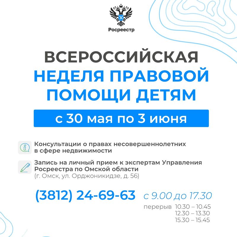 С 30 мая по 3 июня специалисты Управления Росреестра по Омской области и Кадастровой палаты проводят консультации о правах несовершеннолетних в сфере недвижимости в рамках Всероссийской недели правовой помощи детям, приуроченной к Международному дню защиты детей.