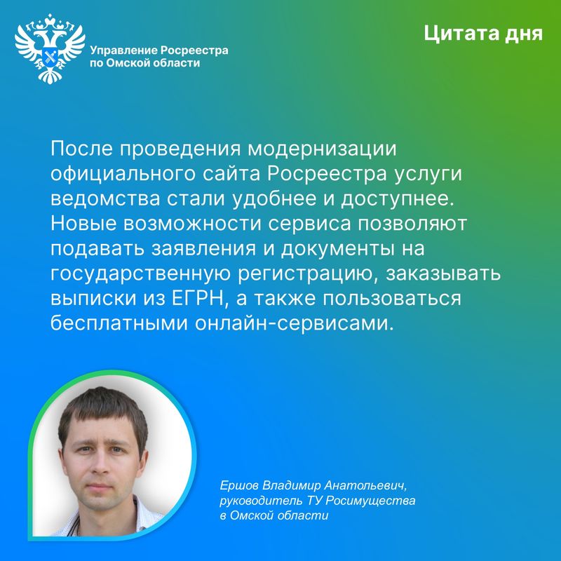Руководитель территориального управления Росимущества Владимир Ершов подчеркнул: «После проведения модернизации официального сайта Росреестра услуги ведомства стали удобнее и доступнее. Новые возможности сервиса позволяют подавать заявления и документы на государственную регистрацию, а также заказывать выписки из Единого государственного реестра недвижимости, пользоваться другими бесплатными онлайн-сервисами».