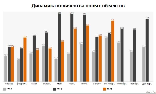 По данным Единого реестра застройщиков, по сравнению с сентябрем 2021 года количество новых объектов увеличилось на 28 %. А по сравнению с августом текущего года количество выведенных на рынок объектов выросло на 33 %.