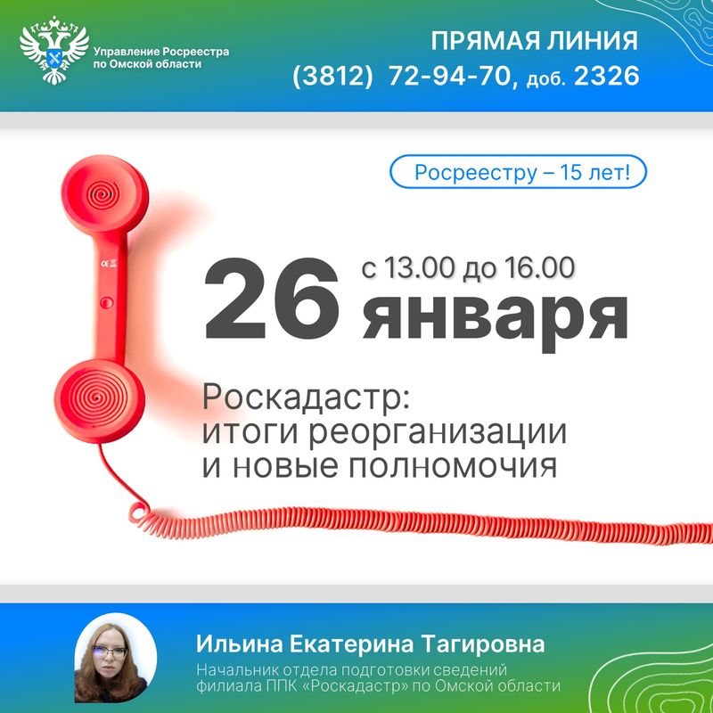 Завтра с 13:00 до 16:00 по омскому времени состоится всероссийская горячая линия, посвященная функциям и полномочиям, возложенным Росреестром с начала этого года на филиал публично-правовой компании «Роскадастр» (до 1 января 2023 года – Кадастровая палата по Омской области). Линия проводится в связи с реорганизацией Кадастровой палаты и 15-летием Федеральной службы государственной регистрации, кадастра и картографии – Росреестра.