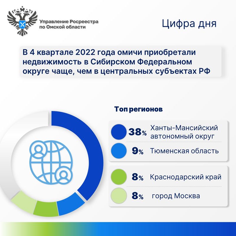 Чаще всего омичи регистрировали права на недвижимость, расположенную в ХМАО-Югре – принято 165 таких заявлений (38 % от общего количества). На втором месте – Тюменская область, принято 37 заявлений (9 %). На третьем и четвертом местах – Краснодарский край и Москва, по 33 заявления (по 8 % на каждый город).