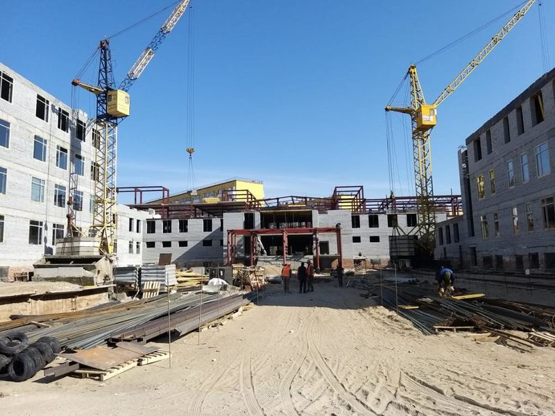 В блоке А, предусмотренном для классов средней школы и старших классов, готовы все 4 этажа. Сейчас строители завершают кирпичную кладку внутренних перегородок помещений. Одновременно приступили к устройству полов 1-го этажа. На блоке В, где расположится начальная школа, продолжают монтаж окон, устройство монолитного перекрытия второго этажа и кирпичную кладку стен 3-го этажа.