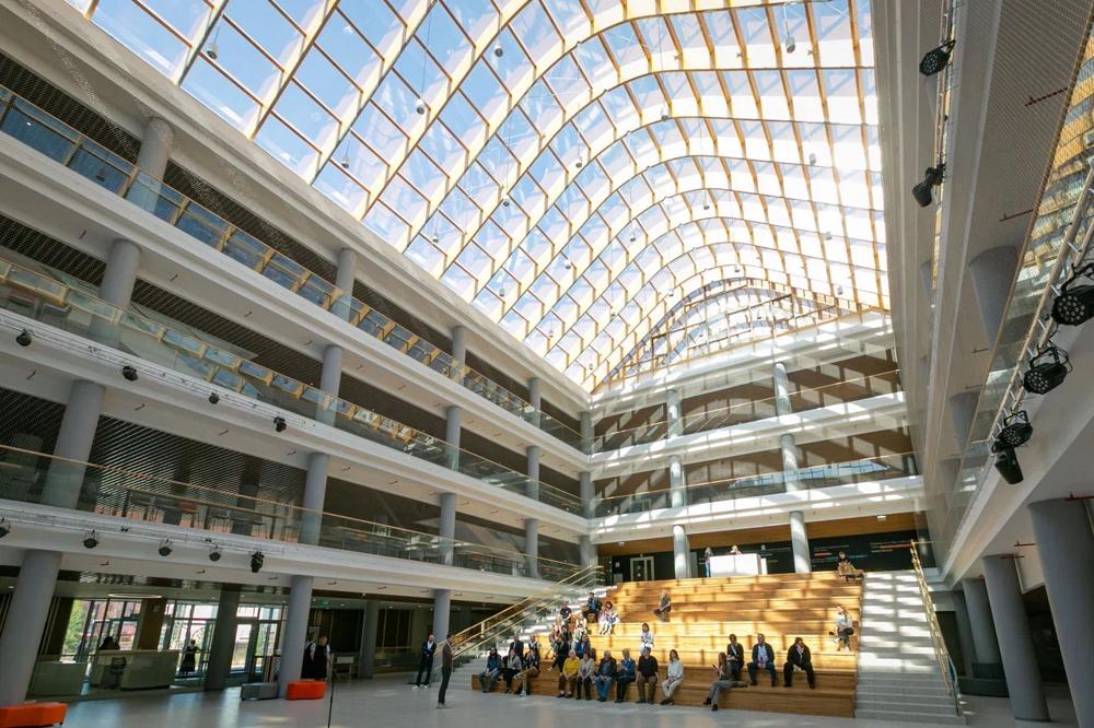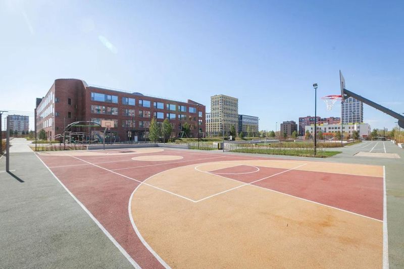 Еще одна особенность здания – стеклянная крыша-купол. Вместо традиционного актового зала в школе запроектировали атриум. Он устроен как многофункциональное пространство с деревянной лестницей-трибуной. Также в школе расположены спортивных зала: большой и малый.