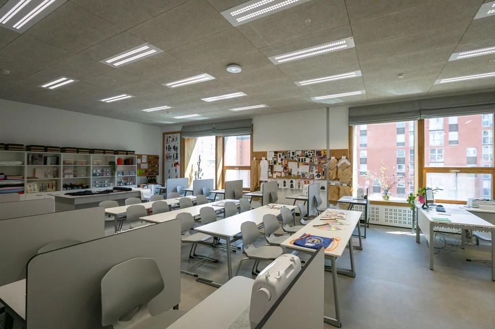 В здании нет технических этажей и подвала, который архитекторы заменили лотками для инженерных коммуникаций и техническими помещениями, расположив их на первом и последнем этажах. Также авторы проекта предложили минимальную площадь внешних фасадов и планировку без деления на тематические классы и четкое распределение пространств.