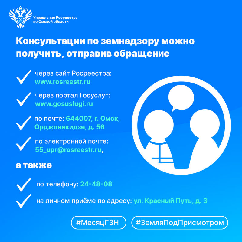 Почтовый адрес для направления обращений: 644007, г. Омск, Орджоникидзе, 56. Электронная почта: 55_upr@rosreestr.ru. Очные консультации по вопросам соблюдения обязательных требований земельного законодательства проводятся начальником отдела государственного земельного надзора Управления с 9:00 до 17.:30 по адресу: ул. Красный Путь, 3, тел.: 8 (3812) 24-48-08.