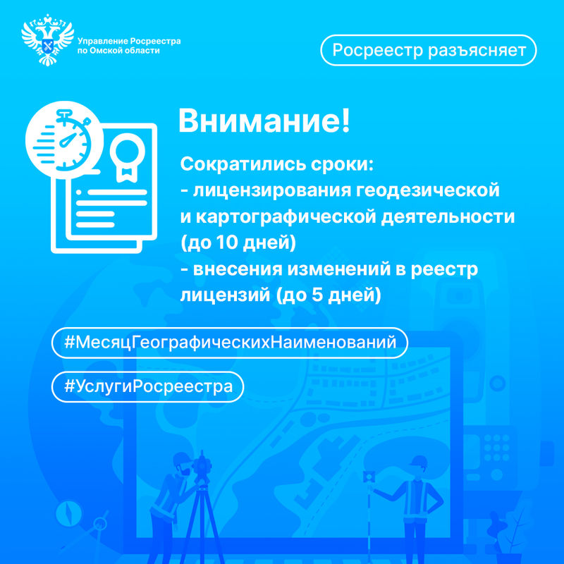 Сокращены сроки предоставления лицензий на осуществление геодезической и картографической деятельности и сроки внесения изменений в реестр лицензий – теперь они составят 10 и 5 рабочих дней соответственно. В части прекращения действия лицензии сроки сокращены до 3 дней со дня приема заявления.