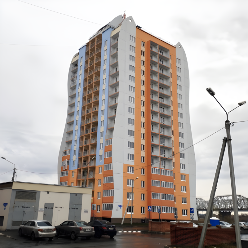 Всего в доме 112 квартир, 48 из которых - однокомнатные, 64 - двухкомнатные. Он имеет 16 этажей и выделяется своим необычным волнистым фасадом.