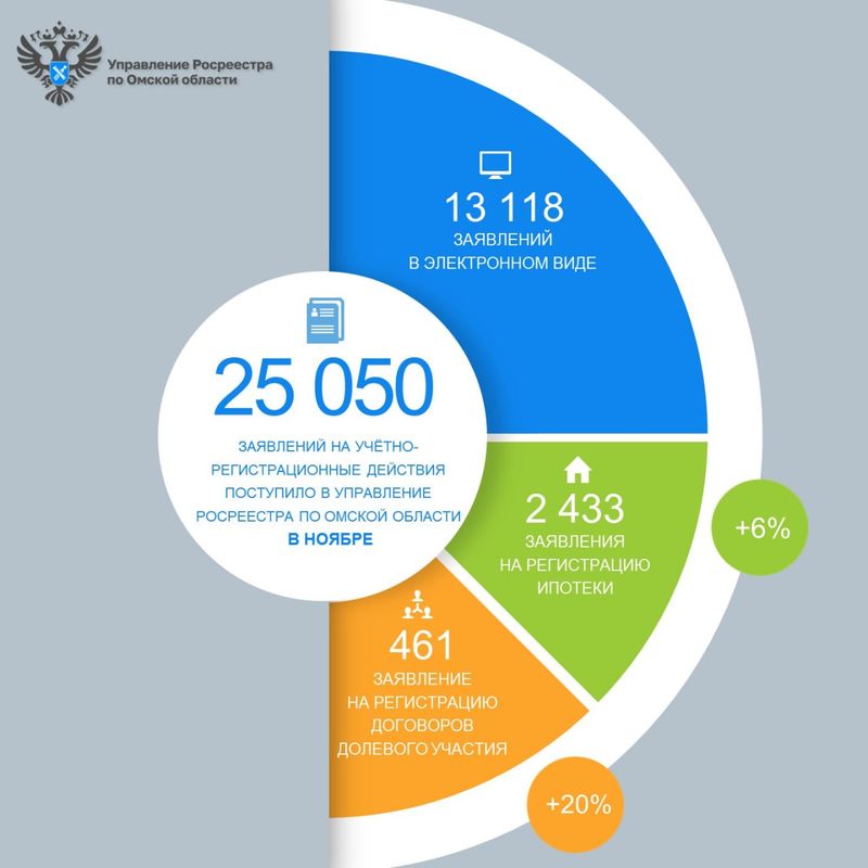 В ноябре в Управление Росреестра по Омской области поступило 25 050 заявлений на учетно-регистрационные действия с недвижимостью. В электронном виде направлено 13 118 пакетов документов – 53 % от общего числа.