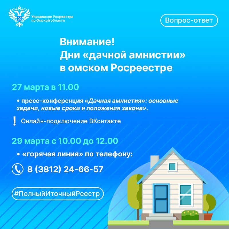 Если после этого у граждан останутся вопросы по упрощенному порядку оформления объектов недвижимости в рамках «дачной амнистии», можно позвонить 29 марта с 10:00 до 12:00 на «горячую линию» омского Росреестра по телефону: 8(3812) 24-66-57.