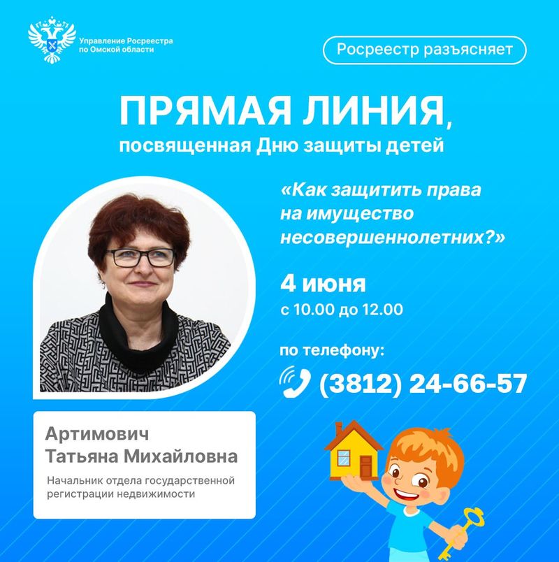 4 июня с 10:00 до 12:00 в Управлении Росреестра по Омской области состоится прямая линия «Как защитить права на имущество несовершеннолетних?», посвященная Дню защиты детей.