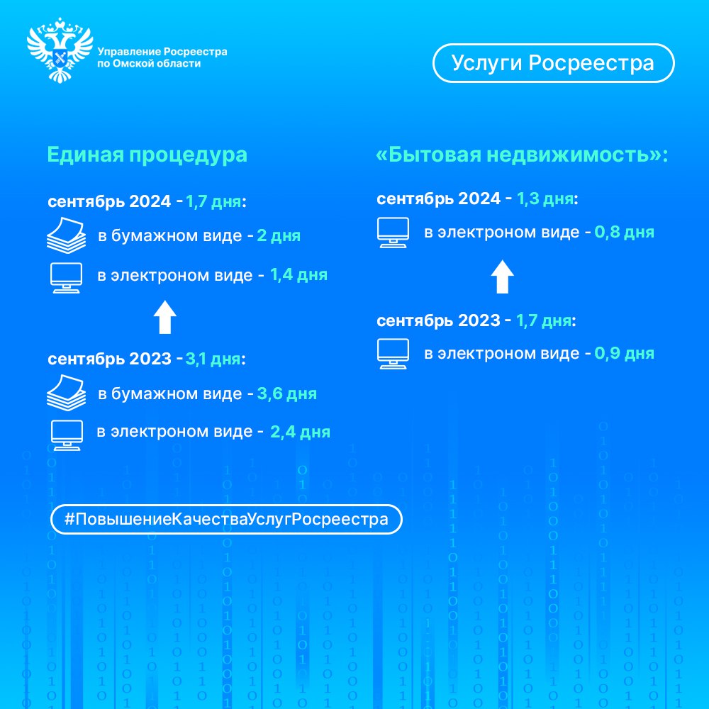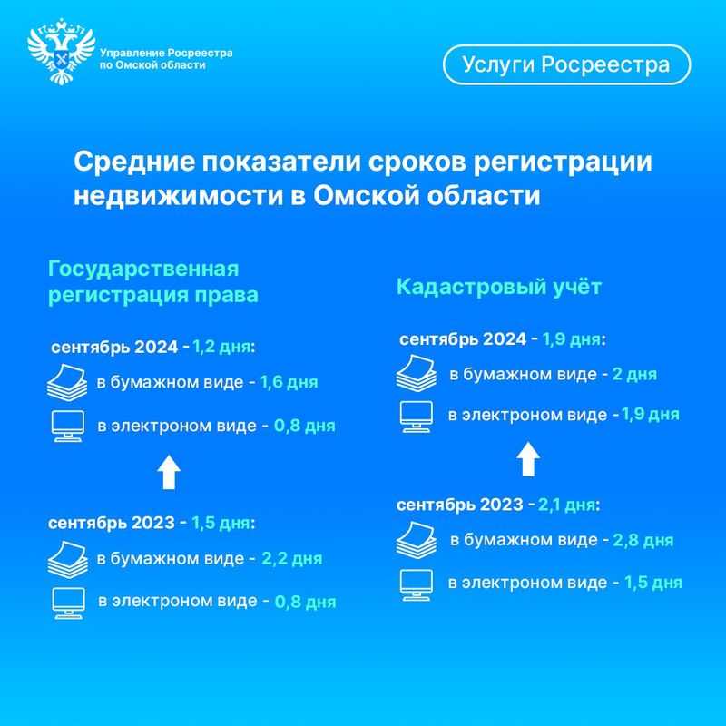 Быстрее всего в омском Росреестре регистрируется бытовая недвижимость (сентябрь 2023/2024 – 1,7 дня / 1,3 дня, в электронном виде – 0,9 дня / 0,8 дня) и электронная ипотека по онлайн-заявлениям банка – 1 рабочий день. В сентябре Управлением зарегистрировано 98,5 % электронных ипотек менее чем за 24 часа.