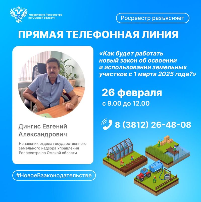 Завтра Управление Росреестра по Омской области проведет прямую линию, посвященную новому закону об установлении 3-летнего срока для освоения садовых, огородных и расположенных в границах населенных пунктов земельных участков.