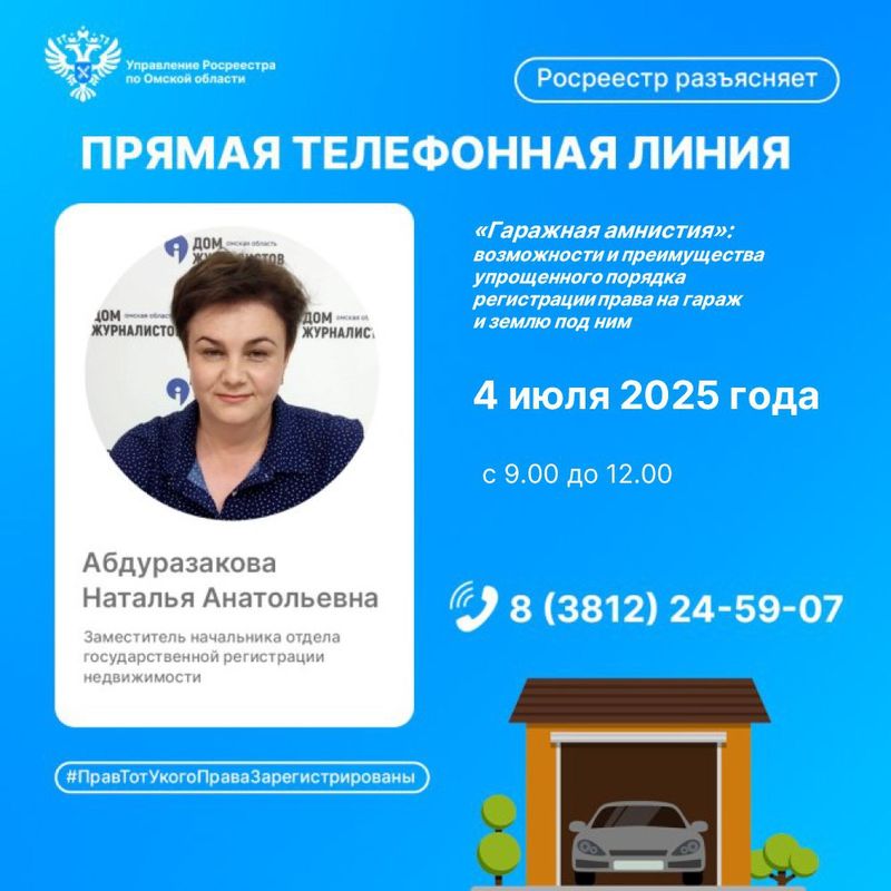 4 июля с 9:00 до 12:00 в Управлении Росреестра по Омской области будет организована прямая линия «Гаражная амнистия»: возможности и преимущества упрощенного порядка оформления права на гараж и землю под ним».