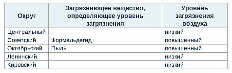 В Советском округе Омска в августе 2011 года отмечено превышения нормы формальдегида в атмосфере, а на территории Октябрьского в воздухе преобладала пыль. Остальные три района Омска сохраняли низкую степень вредных примесей. За месяц не зарегистрировано ни одного случая высокого или экстренно-высокого загрязнения атмосферного воздуха.