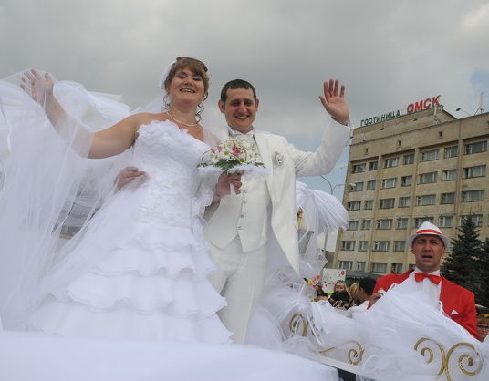 На День города омичи продемонстрировали самую длинную фату и свадебный кортеж.