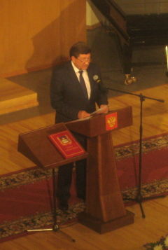 За аплодисментами последовала основная часть инаугурации - принятие присяги. Официально вступив в должность, новый мэр Омска произнес речь, в которой выразил признательность жителям города за высокую честь быть главой города. Градоначальник признался, что почти всю сознательную жизнь провел в Омске, считает город родным и что он ему дорог. По его словам, предоставленная возможность отвечать за судьбу Омска - это огромная ответственность: "Я постараюсь не обмануть ожидания омичей, распорядиться этой ответственностью толково, разумно и по совести", - сказал он.
